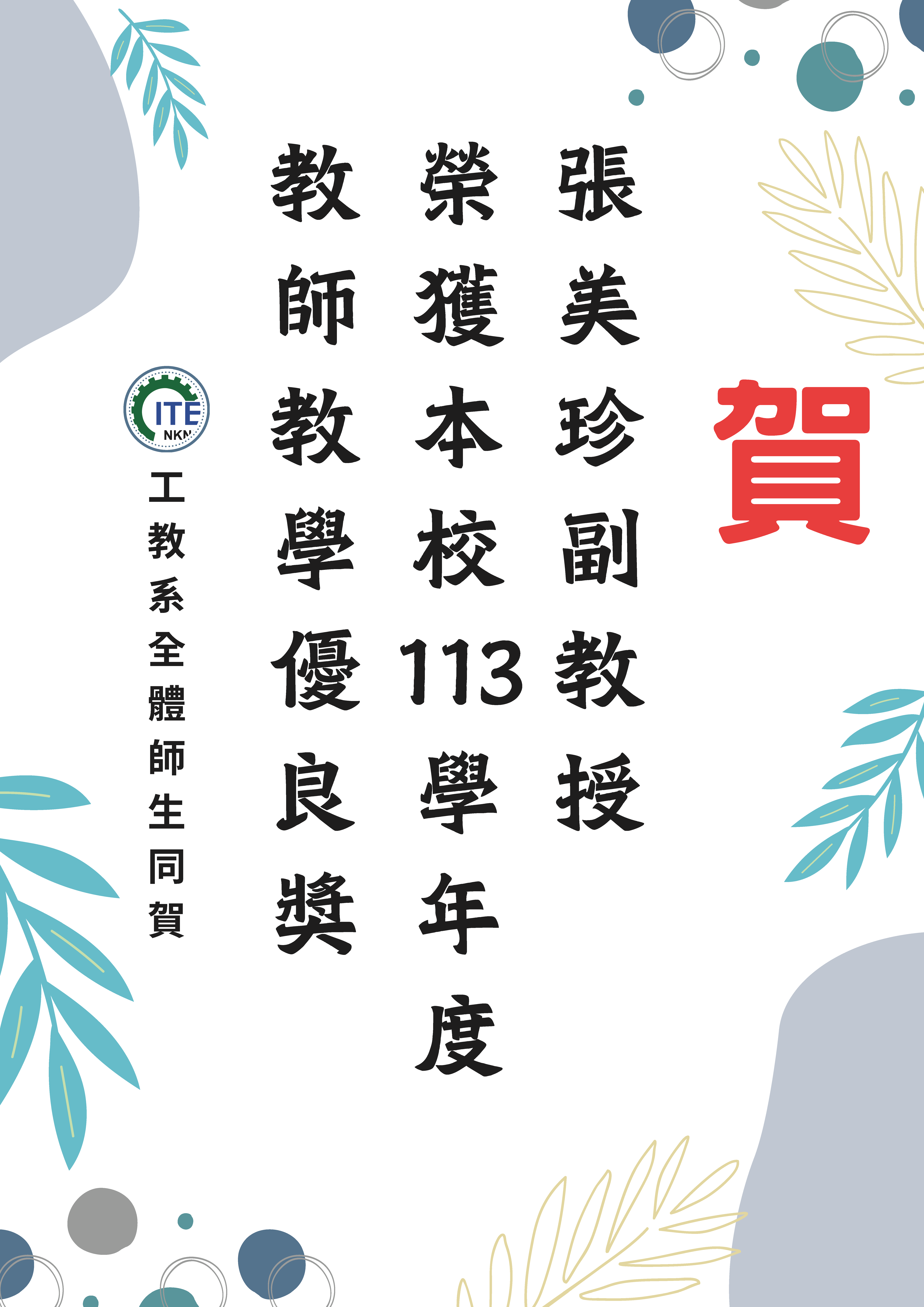 賀!張美珍副教授獲本校113學年度教師教學優良獎