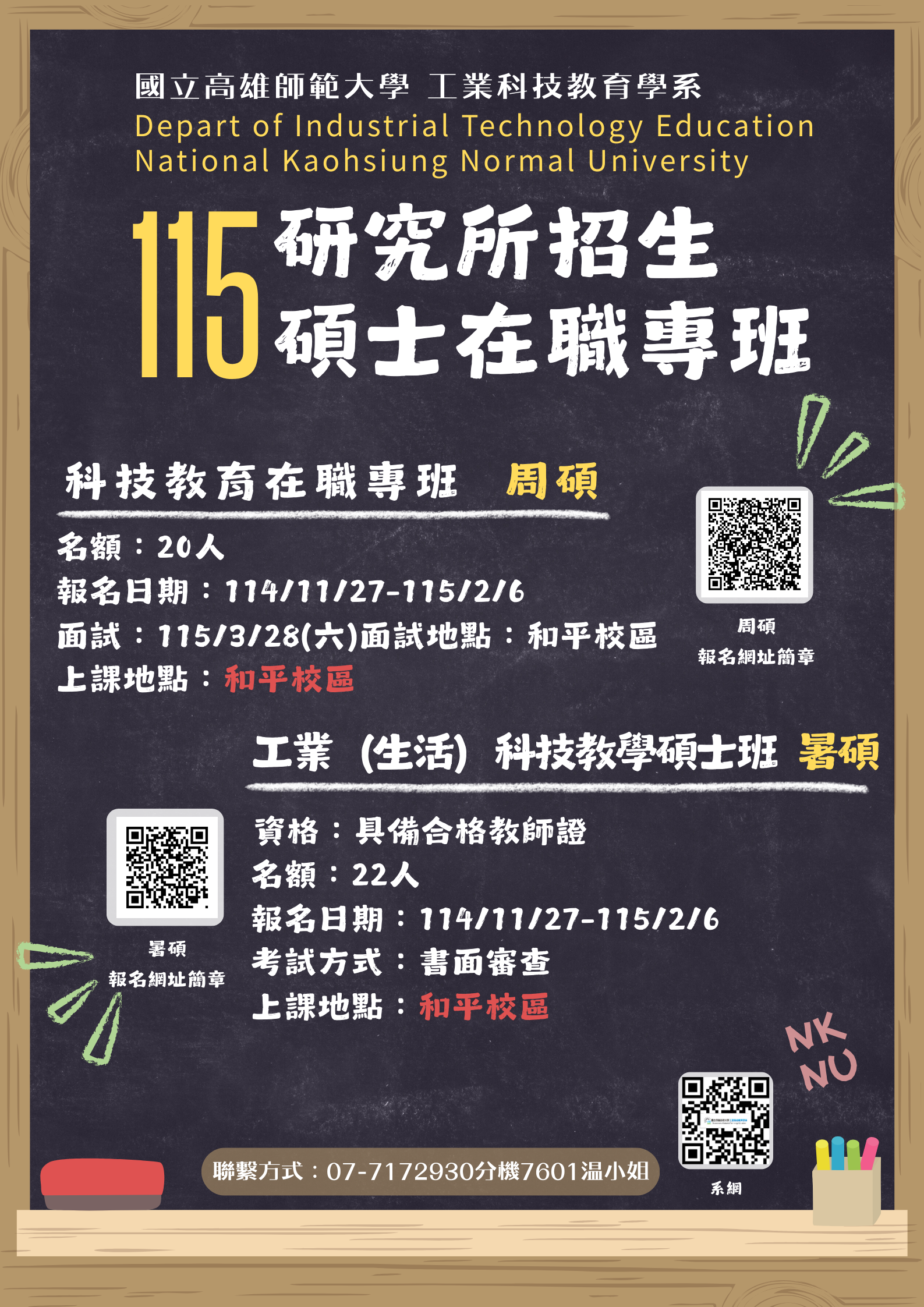 什麼!!!別再猶豫了 115在職專班就要開放報名了 趕緊手刀加入工教系吧 一律採網路報名 ♦️專業師資 專任師資共12位 均為國內外知名大學博士 兼任師資5-10位 均為 產業 或 學術界 專業人員 ♦️學系簡介 工教系以培育具備跨領域、多元能力之人才為目標,為培育科技領域教師及能源空調相關產業工程師之搖籃。本系優質的師資團隊、完善的教學設備、理論實務兼備的課程規劃與產業實習制度等,近年於國高中生活科技教師甄試、校外專題競賽、論文競賽,及研究所入學推甄成果豐碩,獲得國內教育界及產業界的高度肯定。 進修學院設有科技教育碩士在職專班(周碩班)與工業(生活)科技教學碩士班(暑碩班)。暑碩班招收現職國內中小學教師,以科技教育為學習主軸,並培養教師學術研究的能力。周碩班提供國內各領域產業人士及學校教師進修的管道,課程包括科技教育、能源科技、數位科技,及工程科技等跨領域的學習與論文研究。本校進修學院碩士班提供在職教師與業界人士進修的機會,教育目標為培養與增進其科技教育素養、跨領域及學術研究的能力。 ♦️師資培育 本校提供中等學校「生活科技」、「資訊科技」及「電機專長(含冷凍空調)」等類科師資培育教育學程保障名額合計共15名,有意修習教育學程之學生,可於入學後參加師資培育與就業輔導處考試,取得修讀教育學程資格,歡迎欲從事教職之國內相關學系大學畢業生報考。 📢📢報名日期:114年11月27日起至115年2月6日止 報名連結:您是老師暑假想進修請點: https://c.nknu.edu.tw/ccee/NewsDetail.aspx?Nid=2120&GI=2 有在職工作想要週末進修請點: https://c.nknu.edu.tw/ccee/NewsDetail.aspx?Nid=2119&GI=2 上課地點都在和平校區 和平校區 和平校區
