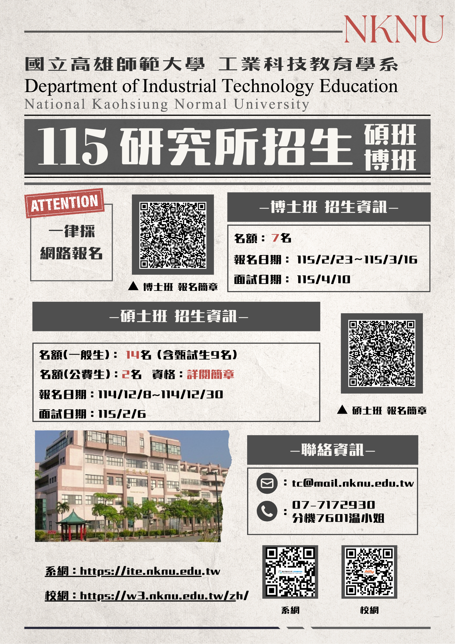🎉號外號外! 115學年度高師大工教系 博、碩士班招生開跑啦! 揪同學、攏作伙, 今年不報名,就要再等一年! 想升級自己?想邁向專業? 那就一定要選 高師大工教系! 📌 一律採網路報名 快來加入我們吧~ ◆日碩班(含公費生) 名額(一般生):14名(含甄試生9名) 名額(公費生):2名 公費生報名資格:詳閱簡章 報名日期:114/12/8-114/12/30 面試時間:115/2/6(五) 報名網址及簡章 ◆博士班 名額:7名 報名日期:115/2/23-115/3/16 面試時間:115/4/10(五) 報名網址及簡章