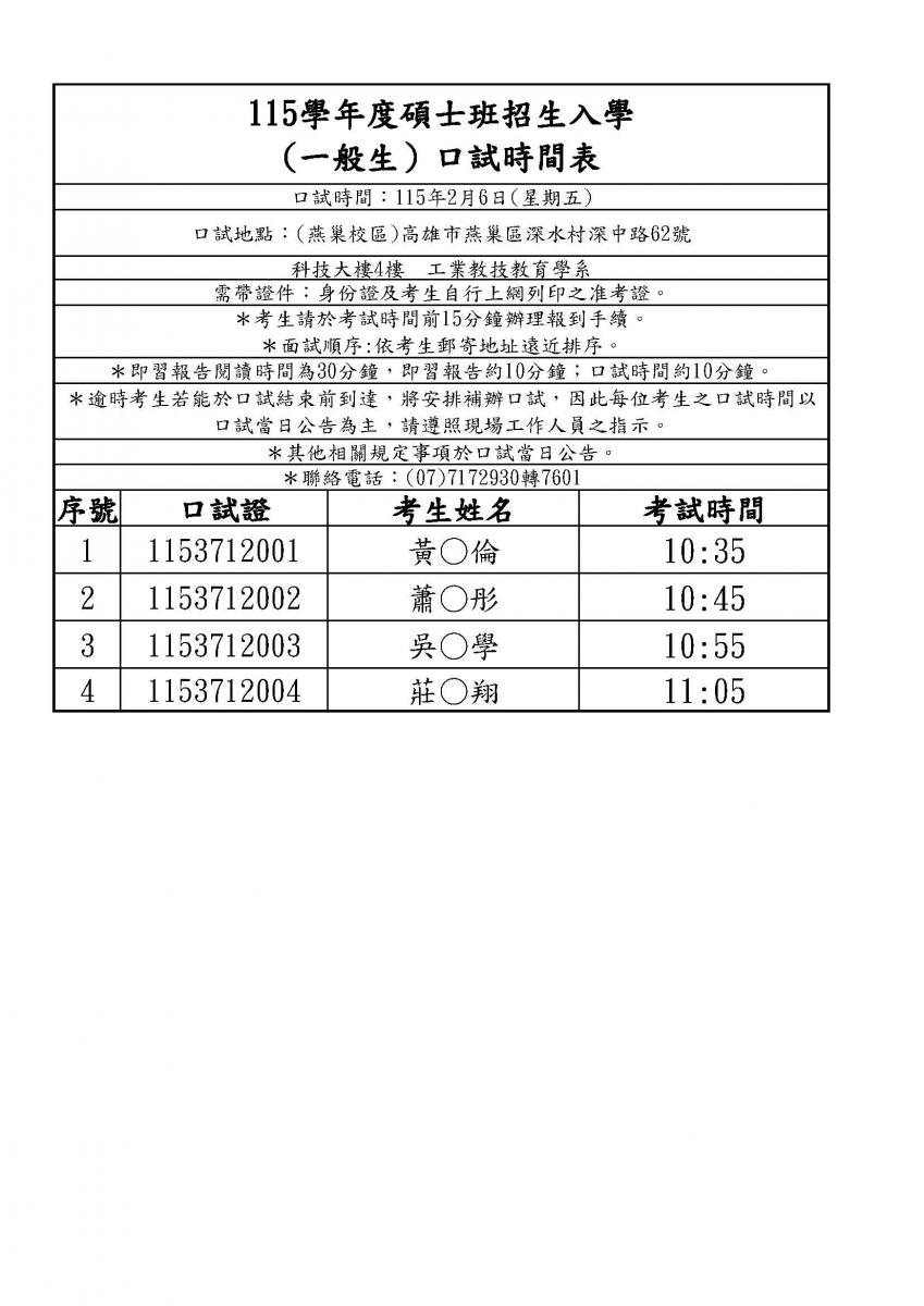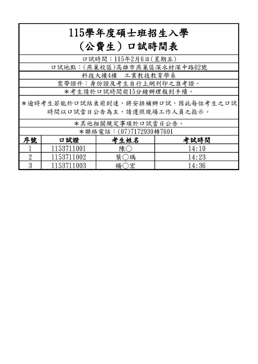 【工教系】115學年度碩士班考試(含公費生)口試日程表—115/2/6(星期五)